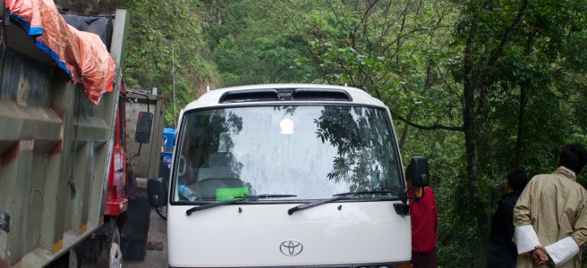 Bhutan has only a few paved roads across the country between Thimphu and any place to the east. The main road is a sometimes one lane, sometimes two lane thoroughfare that includes passenger vehicles, cargo trucks, construction vehicles and farm equipment. Travel on this road is exciting and on virtually every turn, a fascinating dance between truck and car, bus and dump truck.
