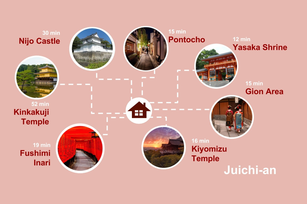 As you step off the train in Kyoto, the people and the station overwhelm you. Hundreds of folks traveling to destinations all over Japan are moving through this train station in the center of the city. After our 45 minute ride from Kansai airport, we head toward the south exit to find Bus #100. We hop on the bus and pay using our bus passes and head west, toward the Higashiyama neighborhood and the rows of traditional Japanese homes called Machiya. After a winding walk through the neighborhood we look around for a small alleyway that opens into a small courtyard of twelve houses….at the end of the courtyard, we find our spot, Juichi-an, number 11.