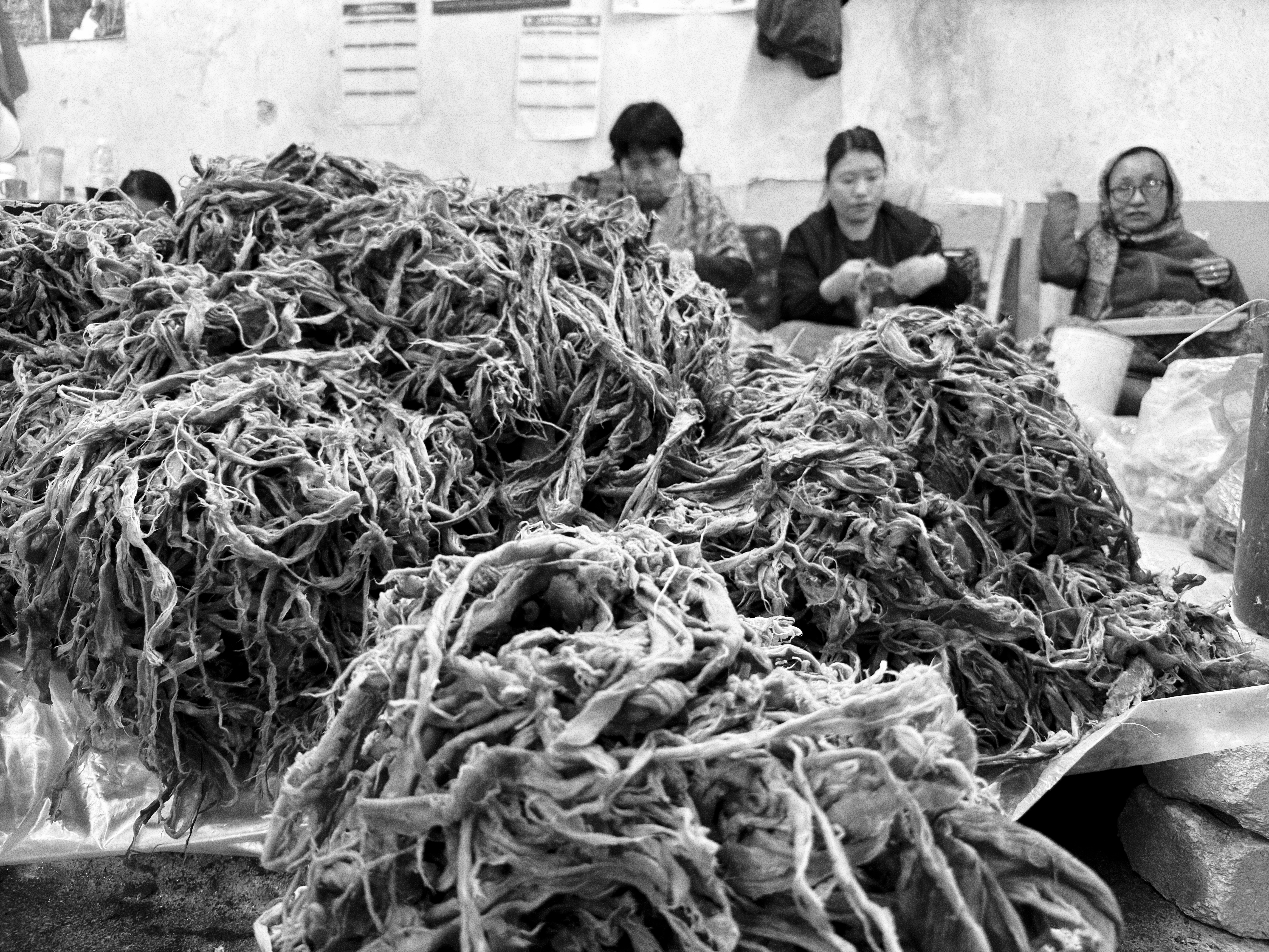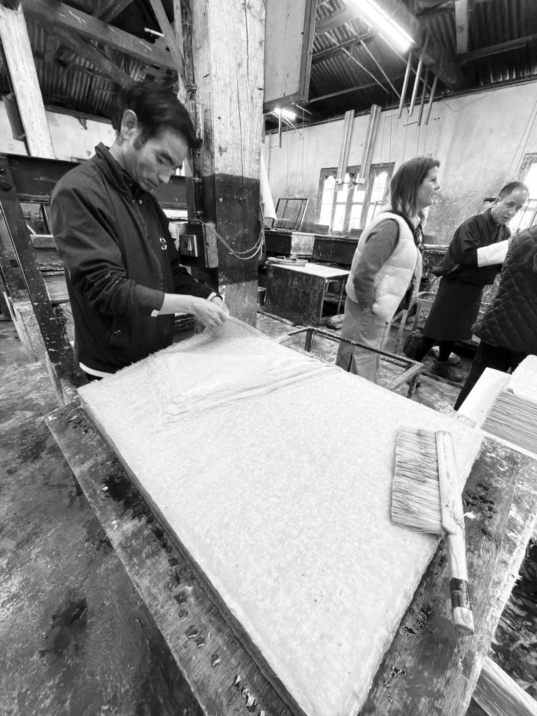 Our morning began at 7:00 AM and after a tasty breakfast, we traveled to the J-P Paper Factory. The process is fascinating and we took our time understanding the paper preparation and asking questions. Made from the bark from the Daphne tree, the bark is stripped, separated by hand, and then made into a mush/slurry in water that is then transferred to a vat where a worker uses a bamboo screen to separate the mush from the water. Individual sheets are pressed and then separated to dry. As you can see from these images, the work is involved and detailed.