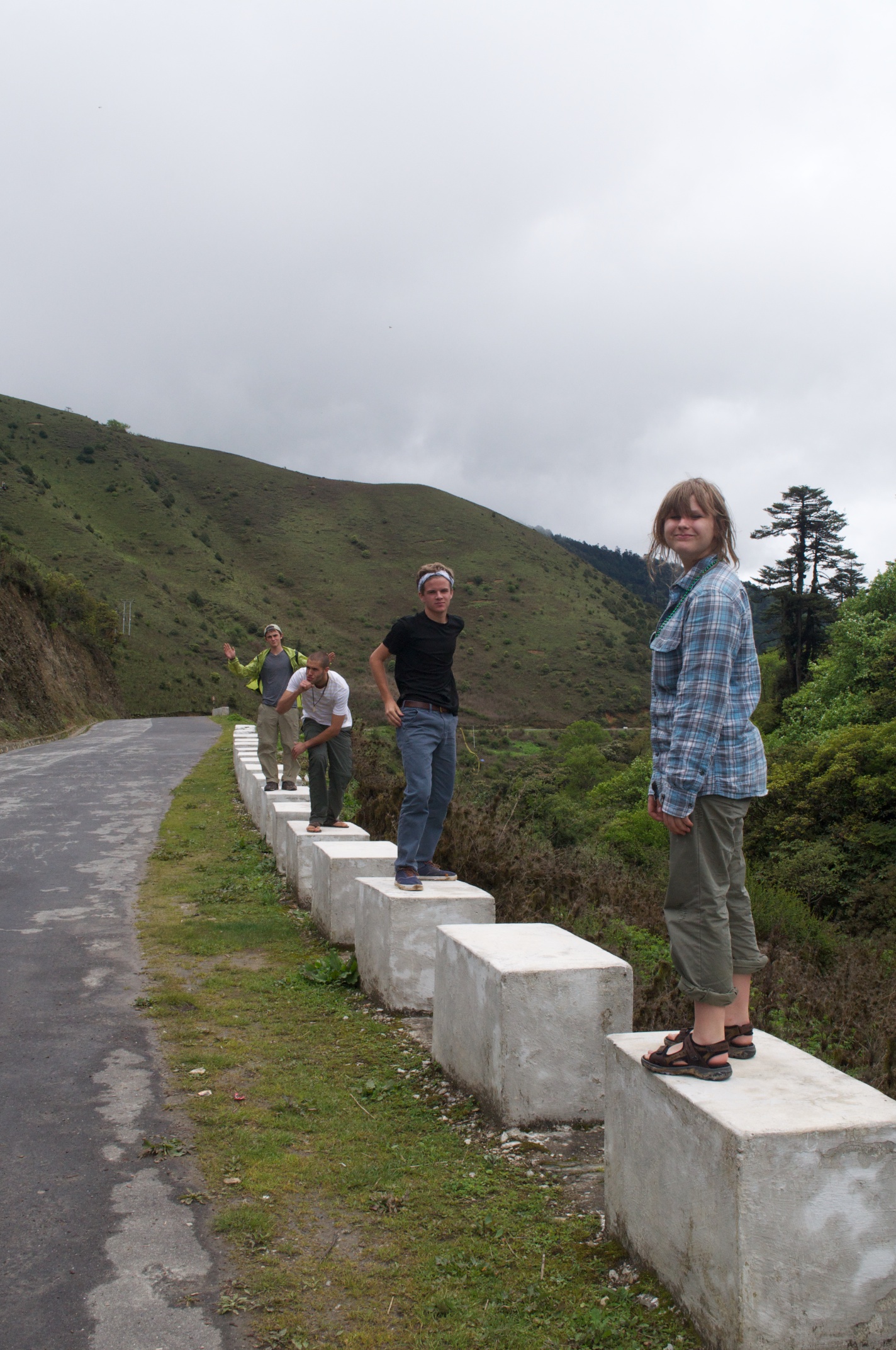 So, the question you may have is: was it dangerous? Yes and no. You could see where the road had taken a beating from the mud and rocks that covered its surface, but somehow the road felt stable….I kept us all away from the edge (as much as Cole wanted to peek at the steep drop to our north), and we walked down the road, our bus trying to negotiate the track.