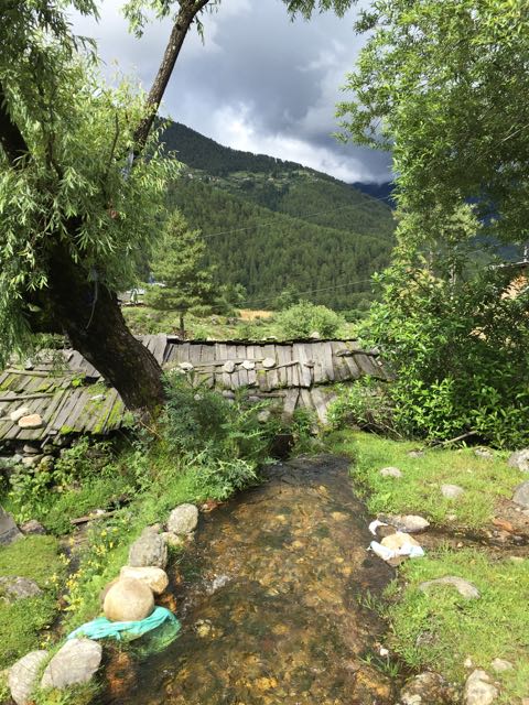 Just across the stream from the house is a working wheat grinding mill, centuries old. We found a woman grinding wheat into flour to be used in the regional dish tsampa. Her work was in a this small, dark building and she managed the grinding wheels as she poured wheat into a basket just above the grinding stone.