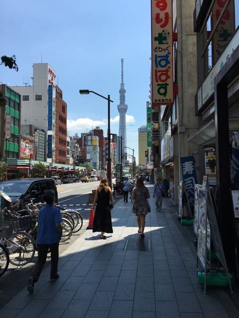 Natascha spied the tower overlooking Asakusa and all of Tokyo, and we decided to walk. Seeing the tower from the temple, it really looks like a 5 to 10 minute walk. Not so. It took us a solid 45 minutes (with a stop for water) walking directly to the building below.