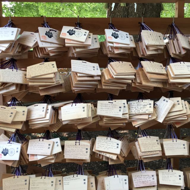 As we waddled on, the day became almost painfully hot. 93 F; 64% humidity. Walking in the sweltering weather, we hoped for a cooler respite in the Meiji gardens. The shade was a blessing, and, as many of you know living in the southern states, shade does not seem to alleviate the heat. Still, we walked through the park, to the shrine. Crews had covered the shrine and were doing some restoration work. We took pictures, hung around for a while, spent some time writing prayers on paper and putting them in a prayer box….then off to shopping!